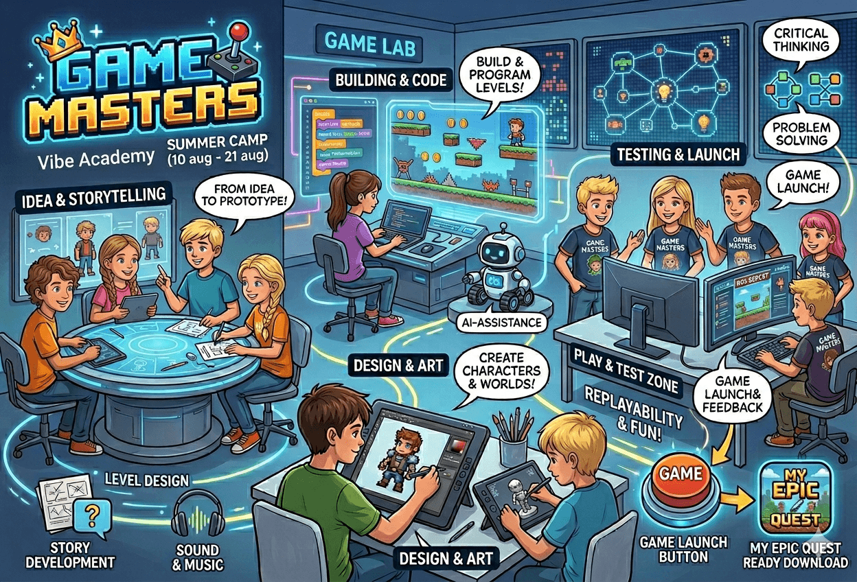 Nu doar jucători, ci și creatori de jocuri! Copiii descoperă cum se construiește un joc de la zero, de la idee și reguli până la design și testare, apoi își lansează propriile creații interactive, dezvoltând logica, imaginația și spiritul de echipă.