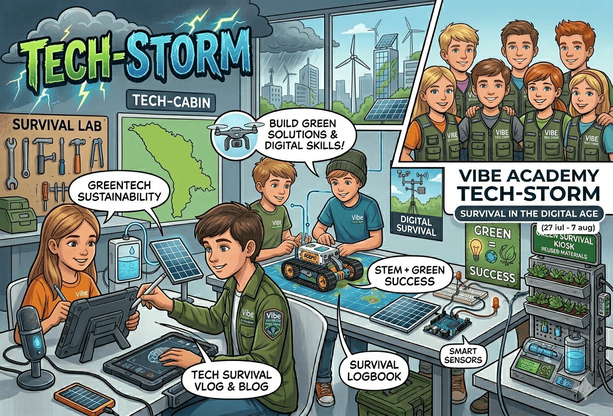 O aventură modernă de supraviețuire, unde copiii combină STEM și GreenTech pentru a găsi soluții ingenioase. Vor construi mecanisme cu LEGO Spike, vor explora circuite electronice și senzori și își vor crea propriul jurnal de supraviețuire prin blog sau video vlog.