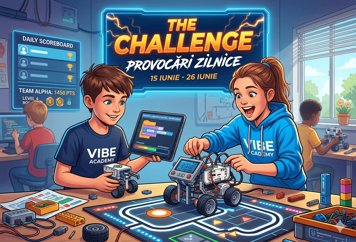 O experiență bazată pe provocări zilnice! Copiii participă la misiuni de coding, robotică și logică, acumulând puncte și deblocând niveluri. Pe parcurs, învață noțiuni noi, iar la finalul turei vor participa la un concurs de inteligență bazat pe tot ce au descoperit și exersat.